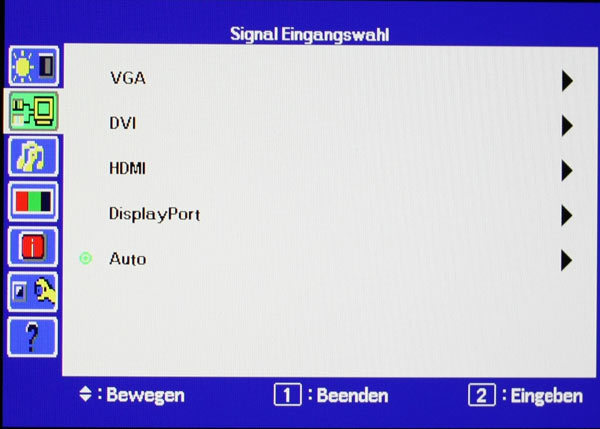 Alle zur Verfügung stehenden Signalquellen sowie eine automatische Signalerkennung sind in diesem Menü gelistet.