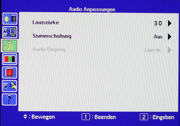 Alle Audioparameter sind in diesem Menü verfügbar. Die Option Audio-Eingang steht nur dann zur Auswahl wenn mehrere Audioquellen angeschlossen sind.