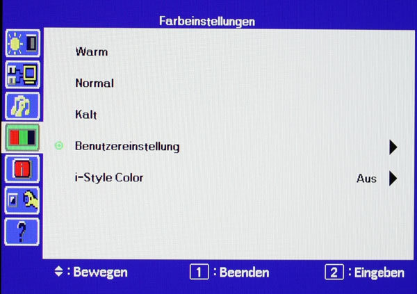 Neben dem Benutzermodus bietet der Iiyama XB2779QS mit Warm, Normal und Kalt noch drei weitere Bildmodi bei denen bis auf die RGB Regler alle sonstigen Bildeinstellungen verfügbar sind. Zusätzlich stehen noch fünf weitere spezielle Bildmodi zur Verfügung, Iiyama nennt sie „i-Style Color“ mit den Bezeichnungen Standard, Landschaft, Video, Spiel und Text. Nachteil dieser speziellen Bildmodi ist, dass keine weiteren Bildeinstellungsoptionen mehr verfügbar sind, noch nicht einmal der Helligkeitsregler. Das ist insbesondere bei Video und Spiel ein echtes Problem da diese Bildmodi mit 80 und 100 Prozent Helligkeit voreingestellt sind. Aber auch der Landschaft Bildmodus ist mit 60 Prozent Backlight-Helligkeit noch sehr hell. Diese Bildmodi eignen sich daher nur unter speziellen Bedingungen wo die Umgebungshelligkeit ebenso hell ist.