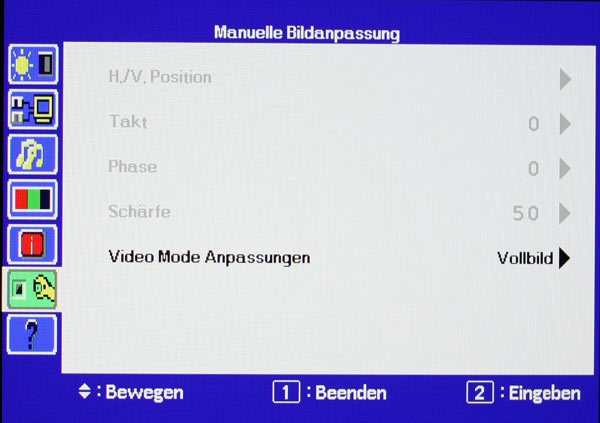 Bei digitaler Zuspielung sind in diesem Menü nur die Schärfe- und Skalierungseinstellung verfügbar, die Schärfe kann allerdings nur bei interpolierten Auflösungen verändert werden. Die anderen Parameter sind dem analogen Betrieb vorbehalten.