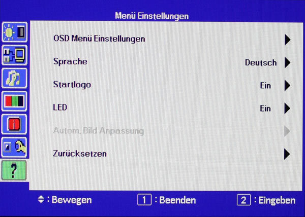 Einstellungen die das OSD selbst betreffen sowie die Möglichkeit alle Einstellungen wieder auf den Werkszustand zurückzusetzen sind in der letzten Kategorie zusammengefasst.
