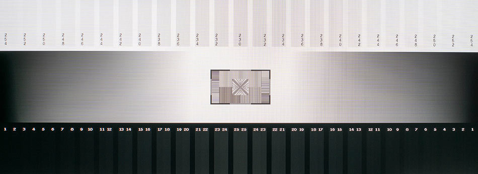 Den Grauverlauf zeigt der Iiyama nahezu perfekt. Auch der für sehr viele Consumer-Geräte problematische Bereich nahe der Mitte, wo reines Weiß in helles Grau übergeht, wird sehr schön homogen dargestellt. Die Graustufendarstellung gelingt dem Display bei den hellen Stufen auch sehr gut und zeigt selbst beim äußersten Feld noch Zeichnung. Die dunklen Graustufen werden hingegen bis zum drittletzten Feld angezeigt.