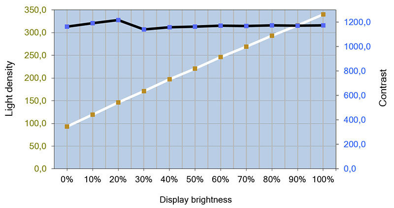 Der angegebene Maximalkontrast von 1000:1 wird mit einem durchschnittlichen Kontrastverhältnis von 1171:1 locker überboten. Bei 20 % Helligkeit wird der Spitzenkontrastwert von 1216:1 erreicht. Auch nach der Kalibrierung bleibt ein sehr gutes durchschnittliches Kontrastverhältnis von 1158:1 übrig.