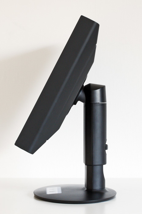 Die Höhenverstellung hat einen Regelungsbereich von knapp 11 cm. In der niedrigsten Einstellung beträgt der Abstand von Rahmenunterkante zur Tischoberfläche 6,7 cm; in der höchsten Position sind es 17,3 cm. Eine Rändelschraube fixiert den Bildschirm während des Transports. Die maximale Neigung nach hinten ist bei etwa 30 Grad erreicht.