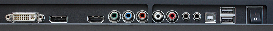 Ungewöhnlich umfangreich präsentiert sich die Anschluss-Leiste des LaCie 324i. In diesem Segment geht es sonst meist relativ spartanisch zu. Für digitale Signale stehen je ein DVI-D-, DisplayPort- und HDMI-Eingang zur Verfügung. Analoge Videosignale können über einen Komponenten-Eingang (YPbPr) zugespielt werden. Analoge RGBHV-Signale werden nicht unterstützt.