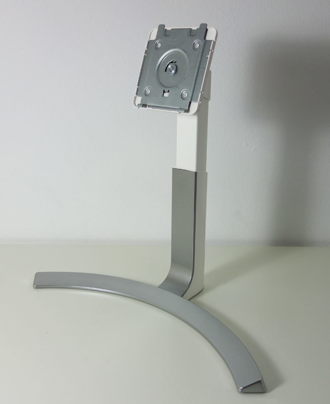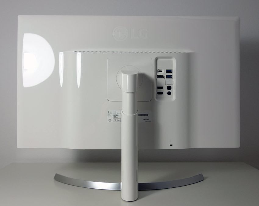 Das momentane Design von LG vereint weiße Hochglanzelemente mit silbernem Metallic-Look. Eine optisch gefällige Kombination mit Wiedererkennungswert. Die Gehäuserückseite des LG 27UD88 ist mit weißem Klavierlack überzogen. Am Standfuß finden sich hingegen weiße und silberne Oberflächen.