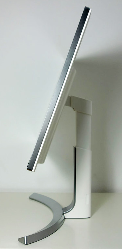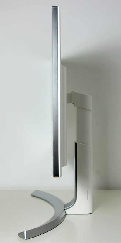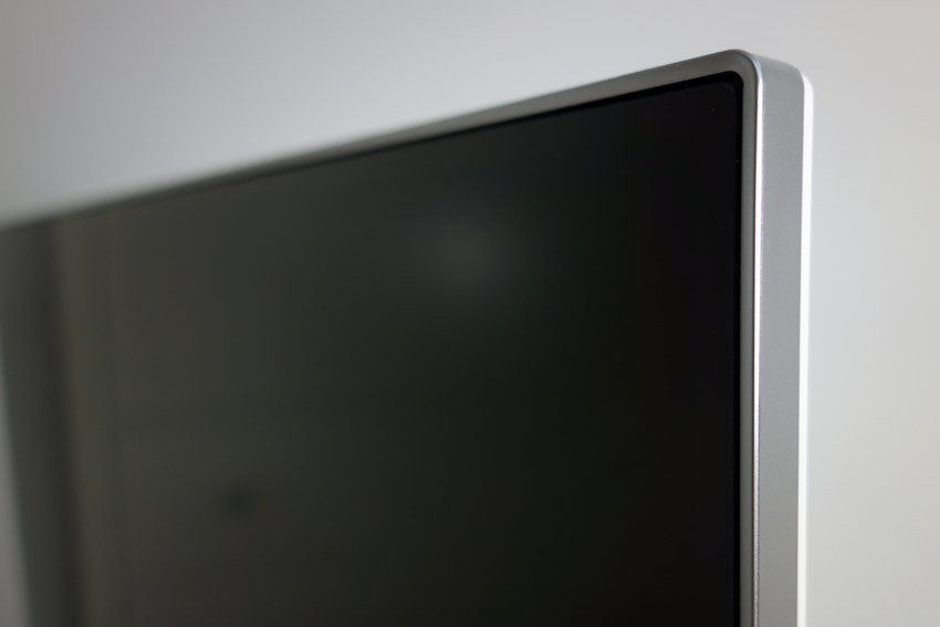 Das rahmenlose Design ist dem aktuellen Trend angepasst. Seitlich zieht sich ein silberner Rahmen um das Gehäuse, welches an der Außenkante nur 1,5 Zentimeter breit ist. Lediglich am unteren Display-Rand befindet sich ein 1,7 Zentimeter breiter schwarzer Rand mit mittig aufgedrucktem Herstellerlogo und -schriftzug.