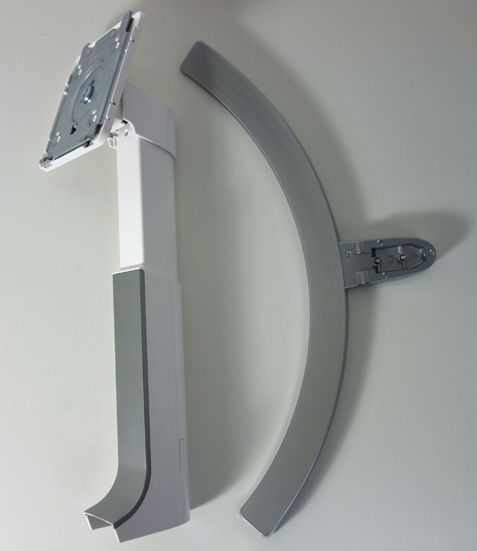 Beim LG 27UD88 ist der zweiteilige Standfuß noch nicht vormontiert. Die Montage ist ohne Werkzeug möglich und schnell erledigt. Mit zwei Daumenschrauben wird der Standfuß am Verbindungsstück von unten angeschraubt. Danach muss der Standfuß an der Gehäuserückseite des LG 27UD88 nur noch in die vorgesehene Halterung eingerastet werden. Der Standfuß besitzt außerdem eine minimalistische Kabelhalterung im unteren Bereich der Rückseite.