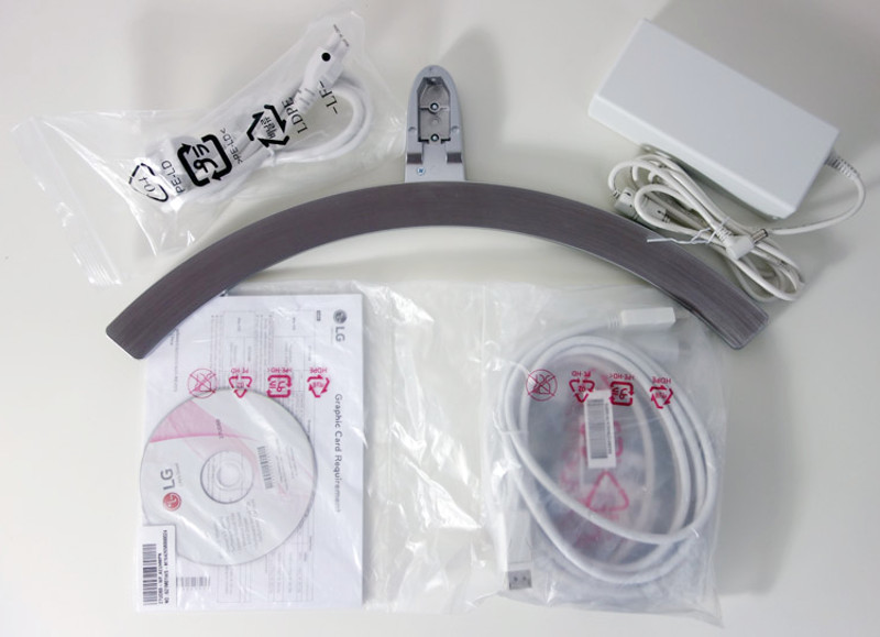 Im Inneren der Schachtel befinden sich zwei Styroporeinlagen, die Monitor, Standfuß und Zubehör sicher fixieren und voneinander trennen. Um Display und Standfuß noch zusätzlich vor Beschädigung zu schützen befinden sich diese in weichen Schaumstoffbeuteln. Außerdem sind alle Hochglanzoberflächen vom Standfuß und Display mit Schutzfolie beklebt.