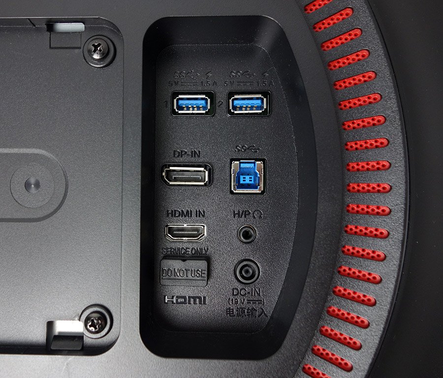 Das Schnittstellenangebot des LG 32GK850G-B ist nicht besonders üppig, doch sind alle notwendigen und aktuellen Anschlüsse für den PC-Betrieb als auch für den Einsatz an einer Spielekonsole vorhanden. Dies sind ein DisplayPort-1.2- und ein HDMI-1.4-Anschluss. Zudem bietet das Gerät einen USB-3.0-Hub und zwei USB-3.0-Anschlüsse sowie einen Kopfhörerausgang. Die Anschlüsse befinden sich etwa mittig auf der Gehäuserückseite.