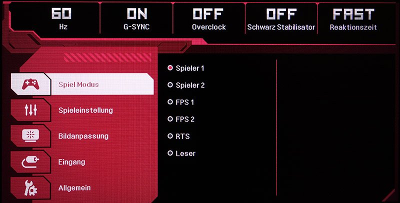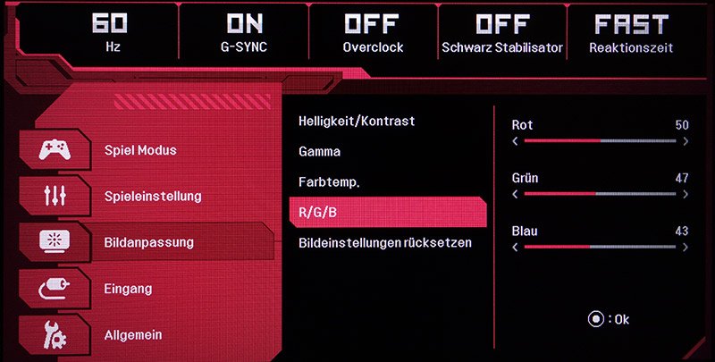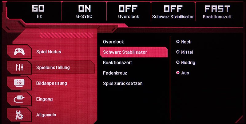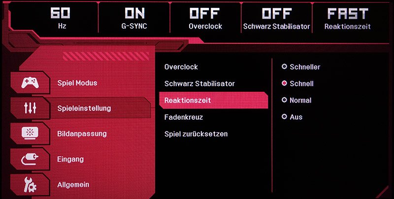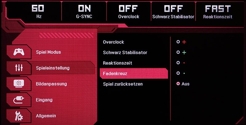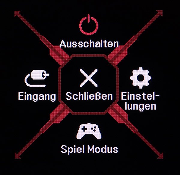 Mit dem Fünf-Wege-Trackball lässt sich sehr komfortabel durch das OSD navigieren. Die Einstellungen sind in fünf Kategorien gegliedert und sinnvoll zusammengefasst. Außerdem ist das OSD optisch ansprechend gestaltet. Am oberen Rand werden die für Gamer wichtigsten Einstellungen groß und immer sichtbar angezeigt.