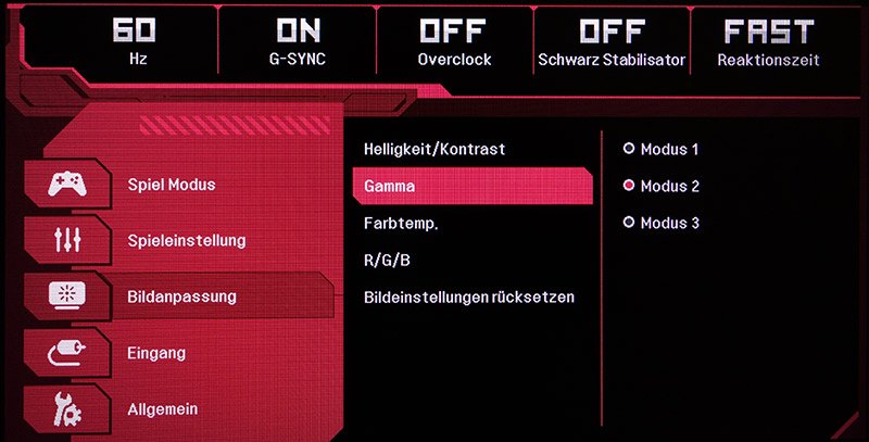 Der Gaming-Monitor besitzt bis auf den Lese-Bildmodus ausschließlich für Spieler optimierte Bildmodi. Ein sRGB-Modus oder Ähnliches wird nicht angeboten. Aber das macht nichts, denn es ist klar, wofür das Produkt konzipiert wurde. Ergo fehlen auch Funktionen wie beispielsweise ein Energiesparmodus oder eine dynamische Kontrastregelung. Das sind ebenfalls Features, die man beim ambitionierten Gaming nicht gebrauchen kann. Daher ist es nur konsequent, diese erst gar nicht anzubieten.