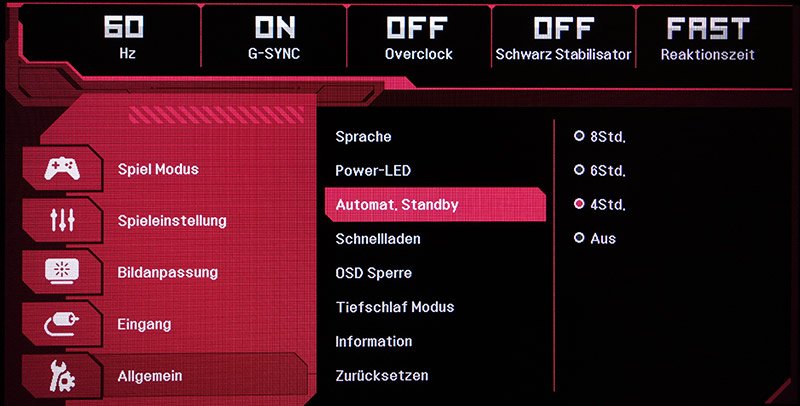 Einen Eco-Modus oder sonstige Stromsparfunktionen bietet der LG 32GK850G-B nicht. Es gibt im OSD einen Menüpunkt „Automat. Standby“ mit den Optionen „Aus“, „4 Stunden“, „6 Stunden“ und „8 Stunden“. Diese Funktion schaltet den Monitor nach der ausgewählten Zeit in den Ruhemodus, unabhängig davon, ob gerade gearbeitet wird. Immerhin wird fünf Minuten zuvor ein Hinweis eingeblendet, dass in Kürze in den Ruhemodus gewechselt wird. Der Anwender hat dann die Möglichkeit, die Meldung mit Ja oder Nein zu bestätigen.