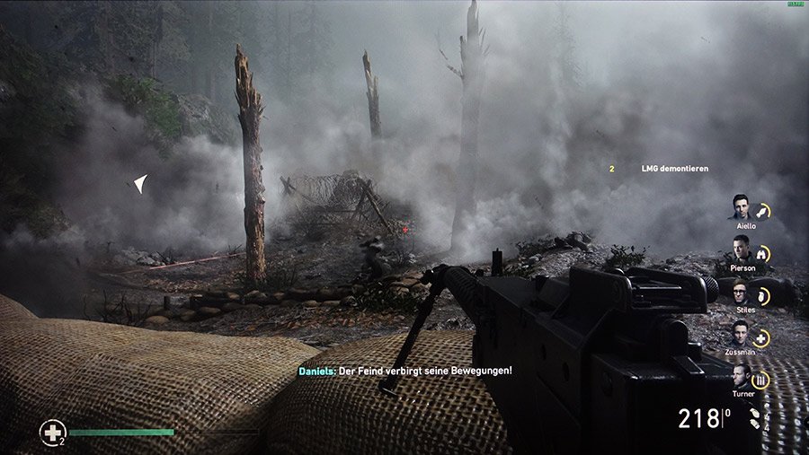Als weiteres Gaming-Feature bietet der LG 32GK850G-B die Möglichkeit, ein Fadenkreuz in der Bildschirmmitte anzeigen zu lassen – entweder als Kreuz oder Punkt und in den Farben Rot oder Grün. Diese Funktion kann dann sehr hilfreich sein, wenn vom Spiel selbst in gewissen Situationen kein Fadenkreuz angezeigt wird. Bei Call of Duty: WW II ist das beispielsweise dann der Fall, wenn man ein stationäres MG benutzt.