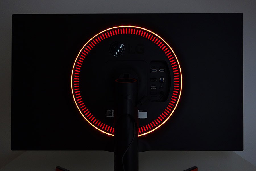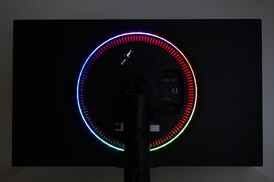 Ein außergewöhnliches optisches Merkmal des LG 32GK850G-B ist eine LED-Beleuchtung, die vom Hersteller „Sphere Lighting“ genannt wird. Diese befindet sich auf der Gehäuserückseite in Form eines Kreises. Über ein Steuerrad mit Klickfunktion rechts neben der Bedientaste an der Gehäuseunterseite lässt sich die Beleuchtung ein- und ausschalten bzw. ändern. Zudem ist das Steuerrad zugleich ein Helligkeitsregler. Es können verschiedene Einzelfarben ausgewählt werden. Als spezielle Lichteffekte sind „Peaceful Lighting“ (langsamer und angenehmer Farbwechsel) und „Dynamic Lighting“ (schneller, im Kreis laufender Farbwechsel) einstellbar. Da eine Hintergrundbeleuchtung die Augen schont und Ermüdungen vorbeugen soll, hat diese Funktion neben dem offensichtlichen optischen auch noch einen praktischen Nutzen.