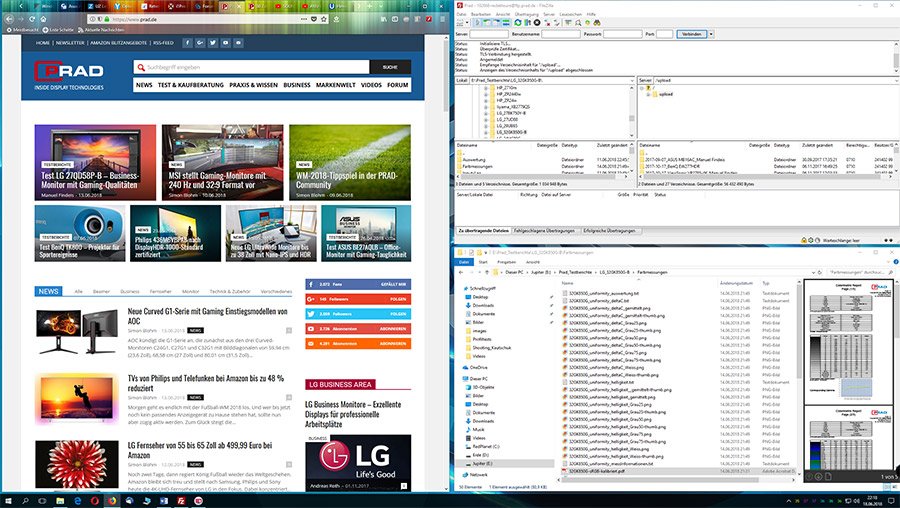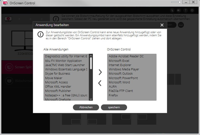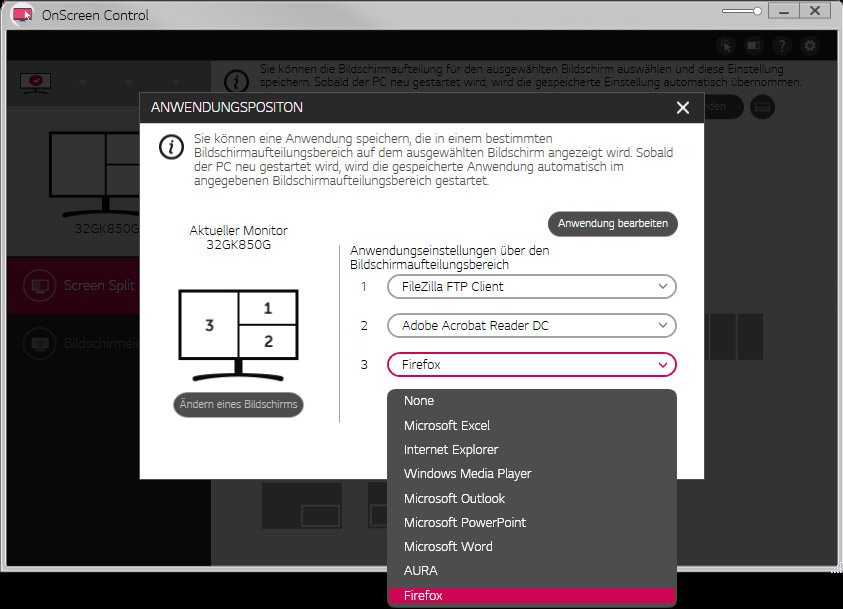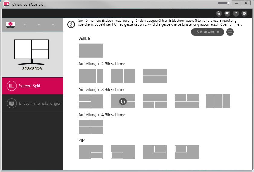 Wie alle neuen Bildschirme von LG unterstützt auch der 32GK850G-B die herstellereigene Software „OnScreen Control“ zur Teilung des Bildschirms in verschiedene Bereiche sowie zur Steuerung des OSDs direkt im Programm. Auf der mitgelieferten CD ist „OnScreen Control“ zwar vorhanden, wir haben aber direkt auf der LG-Website die aktuellste Version 2.89 heruntergeladen und installiert.