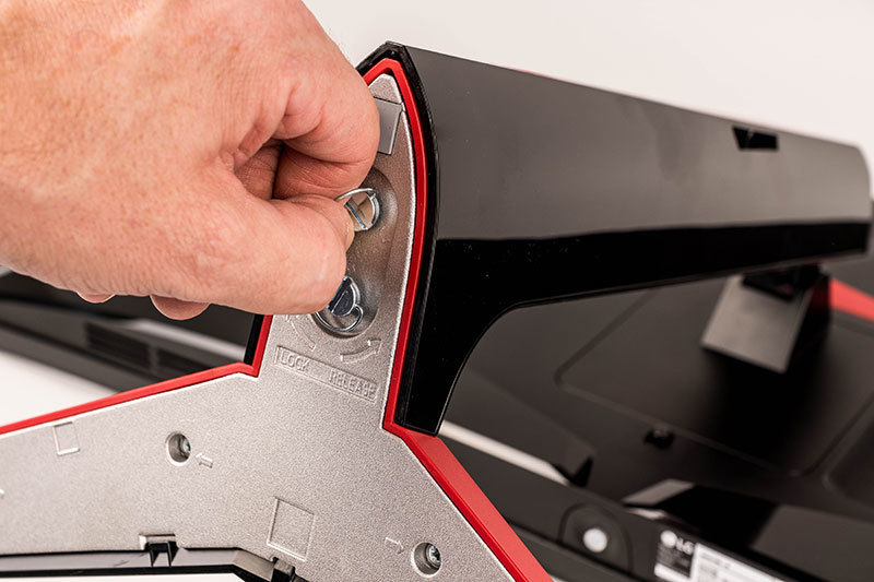 Der Zusammenbau im Anschluss funktioniert vollkommen werkzeugfrei und stellt keine Herausforderung dar. Die Basisplatte des Tragarms wird über eine Einrastfunktion mit dem Display verbunden. Im Anschluss wird der Fuß über zwei Schrauben, die für den werkzeugfreien Aufbau über einen Bügel verfügen, auf der Unterseite mit dem Tragarm verbunden. Der Kopfhörerhaken, der gleichzeitig für das Kabelmanagement zuständig ist, wird auf der Rückseite des Tragarms eingeklickt.