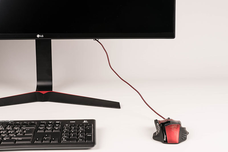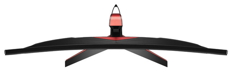 Bis auf die Unterseite des Fußes besteht der gesamte Monitor aus schwarzem Kunststoff mit roten Akzenten. Das Panel verfügt oben und an den Seiten über ein rahmenloses Design und ist auch nur dort eingefasst.