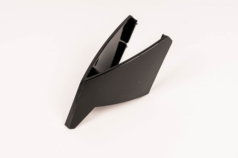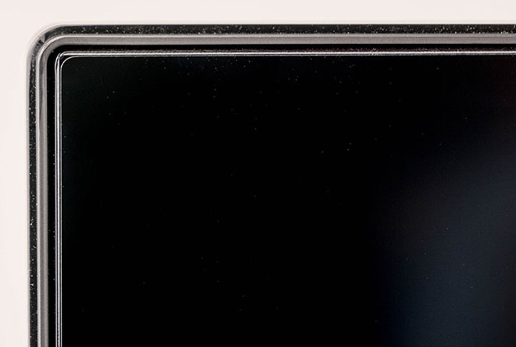 Die Tiefe des Displays beträgt 20 mm und verfügt an den Außenseiten ebenfalls über das Klavierlack-Finish. Die Rückseite ist horizontal zweigeteilt. Die 20 mm Tiefe werden über den gesamten oberen Bereich gehalten, während der untere Bereich von den Außenseiten her an Tiefe gewinnt, um für die Elektronik Platz zu schaffen.
