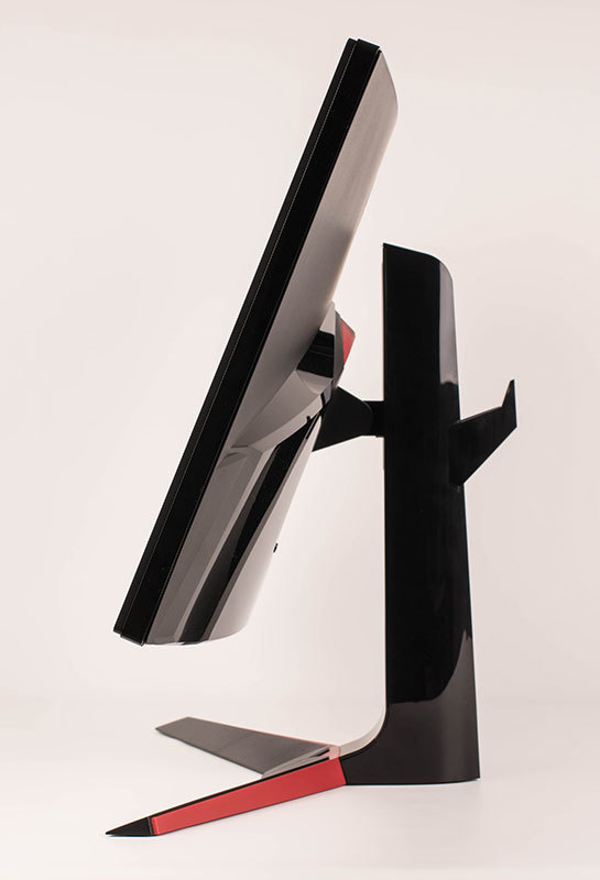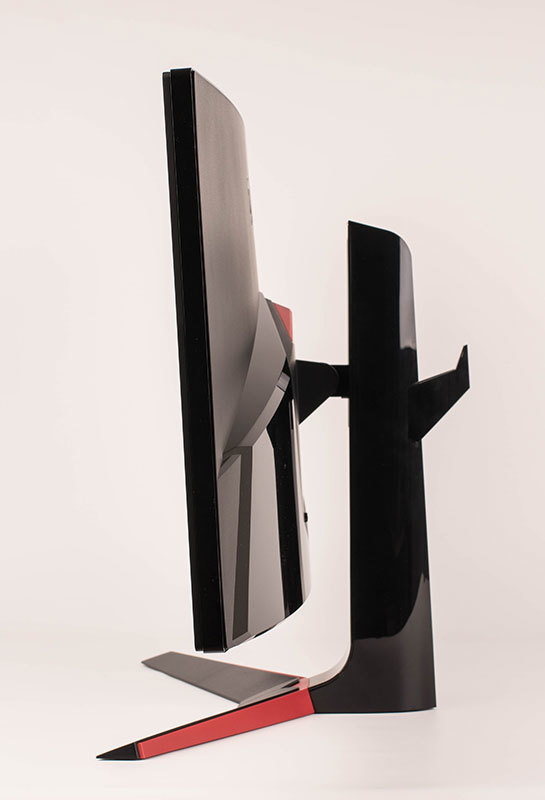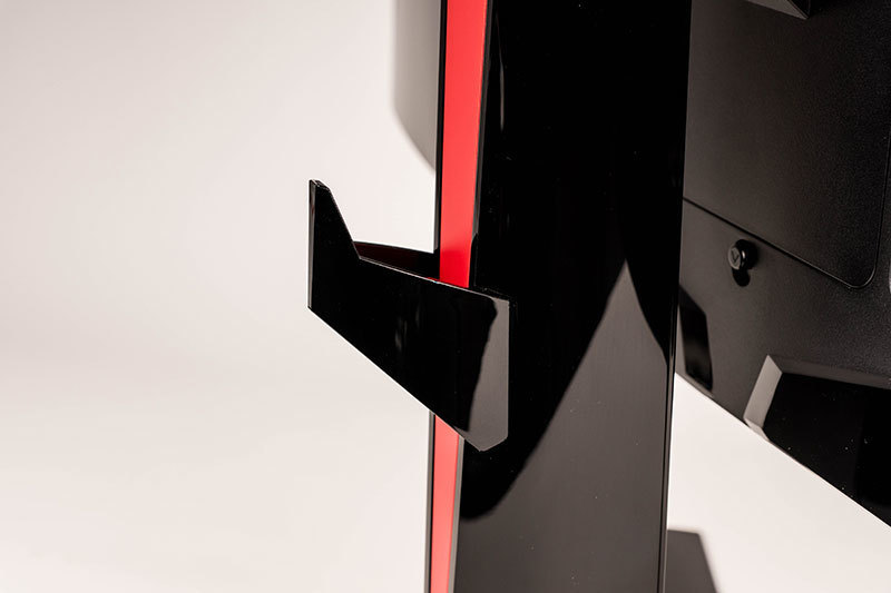 Auch hier kommt zum größten Teil die Klavierlack-Oberfläche zum Einsatz und rahmt den mittleren Bereich der Basis und des Anschluss-Panels ein. Letzteres ist sehr gut zu erreichen und verfügt über eine horizontale Kabelführung. Das Display ist über die Basisplatte mit dem Tragarm verbunden und mündet dort in den Schlitten der Höhenverstellung. Die Außenseiten des Tragarms verfügen abermals über das Klavierlack-Finish, während auf der Rückseite als Highlight ein roter Keil eingearbeitet ist.