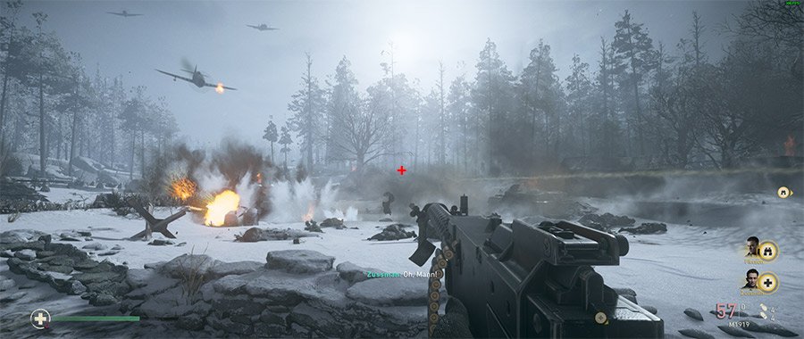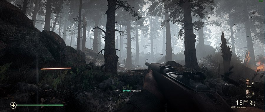 Ein weiteres Feature ist die Anzeige eines Fadenkreuzes in vier verschiedenen Varianten: als grüner und roter Punkt sowie grünes und rotes Plus. Mithilfe dieser mittig auf dem Bildschirm platzierten Markierung soll das Anvisieren von Gegnern einfacher möglich sein. Nun, der Punkt geht in einem schnellen Gefecht schon mal gänzlich unter. Das grüne Plus ist da nicht viel besser. Einzig das rote Plus ist gut sichtbar und kann eine Hilfe beim Anvisieren der Gegner sein, wenn man aus der Hüfte feuert. Solche Gimmicks sind sicherlich Geschmacksache, und wenn es hilft: umso besser.