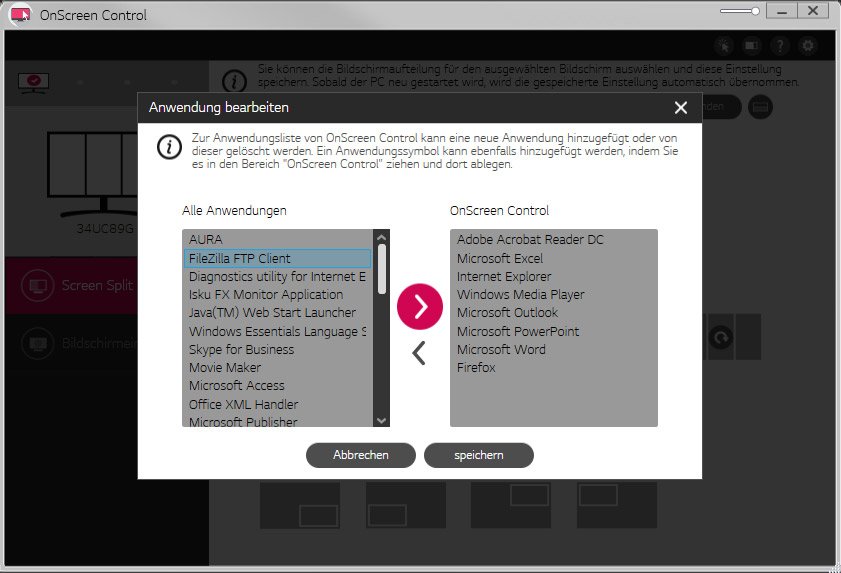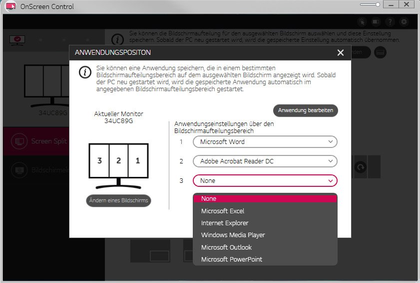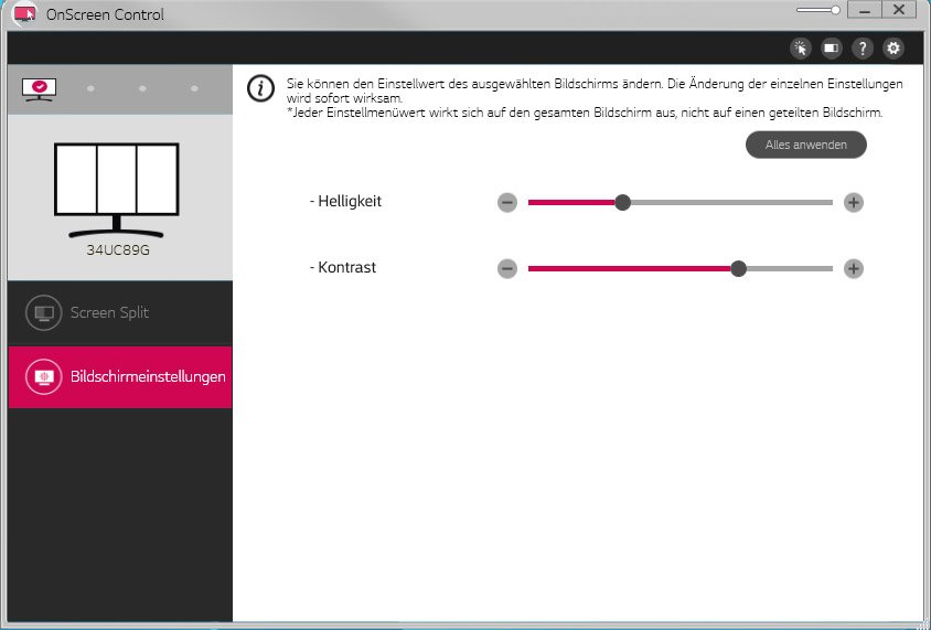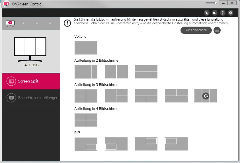 Auch der 34UC89G-B unterstützt die LG-eigene Software OnScreen Control zur Teilung des Bildschirms in verschiedene Bereiche sowie zur Steuerung des OSDs direkt im Programm. Auf der mitgelieferten CD ist OnScreen Control zwar vorhanden, wir haben aber von der LG-Webseite die aktuellste Version 2.82 heruntergeladen und installiert.