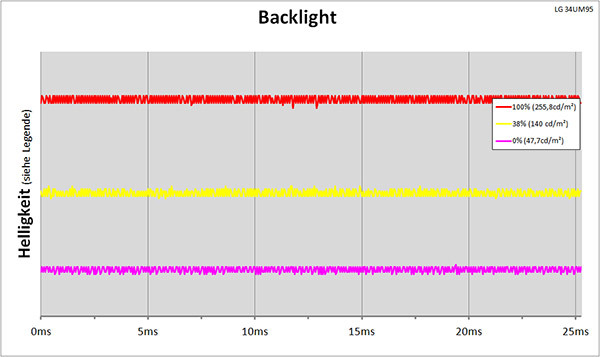 Die Hintergrundbeleuchtung des LG 34UM95-P arbeitet mit White LED und leuchtet kontinuierlich. LG vermarktet dieses Feature unter dem Begriff „Flicker Safe“. Der Vergleich im Diagramm zeigt: sowohl bei voller als auch bei reduzierter Einstellung der Helligkeit wird der Lichtstrom nicht unterbrochen, wie das bei PWM-Backlights der Fall wäre.