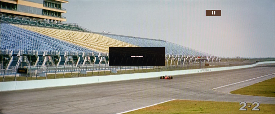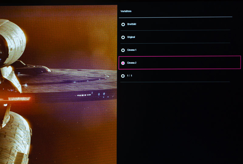 Abhilfe schafft das „Seitenverhältnis“-Menü im OSD. Wir empfehlen den „Cinema Modus 1“. Dieser zoomt das Bild auf die gesamte Bildfläche und behält das native Seitenverhältnis des Filmmaterials bei. Dabei schneidet es die schwarzen Balken sozusagen ab. Einziges Problem dabei ist, dass leider auch die Menüs des BluRay-Players und die der BluRay selbst mit abgeschnitten werden. Während des Films ist dies jedoch die beste Lösung.
