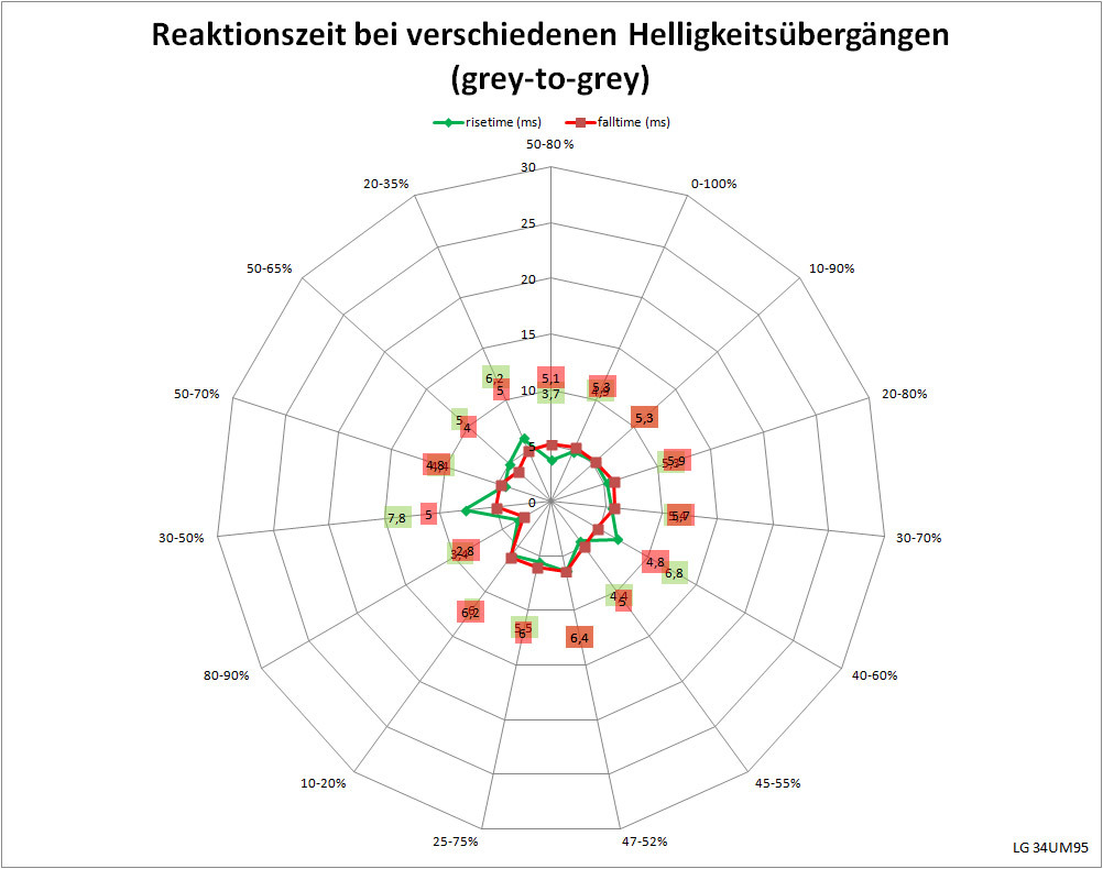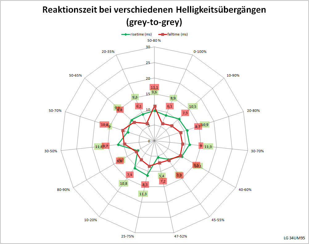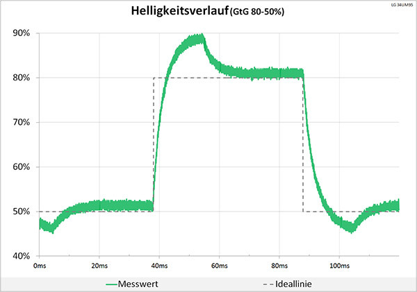 Für Gamer sind diese Werte zwar noch nicht das Non-Plus-Ultra, aber für einen Allround-Monitor dieser Größe gehen die Schaltzeiten völlig in Ordnung. Allerdings wurden die schnelleren Zeiten auf Kosten der Neutralität beim Helligkeitsverlauf erkauft. Die Überschwinger sind jetzt deutlich erkennbar und Artefakte können auftreten. Hier wurde das Limit des Panels erreicht und es ist gut, dass LG nicht noch weiter an der Geschwindigkeitsschraube gedreht hat.