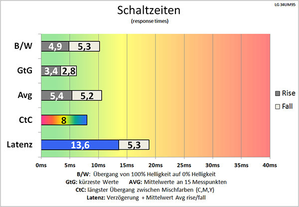Die Latenz ist ein wichtiger Wert für Spieler, wir ermitteln sie als Summe der Signalverzögerungszeit und der halben mittleren Bildwechselzeit. Beim LG 34UM95-P messen wir mit 13,6 Millisekunden bei 60 Hz eine noch akzeptable Signalverzögerung. Die halbe mittlere Bildwechselzeit ist mit 5,3 Millisekunden kurz, die mittlere Gesamtlatenz beträgt 18,9 Millisekunden.