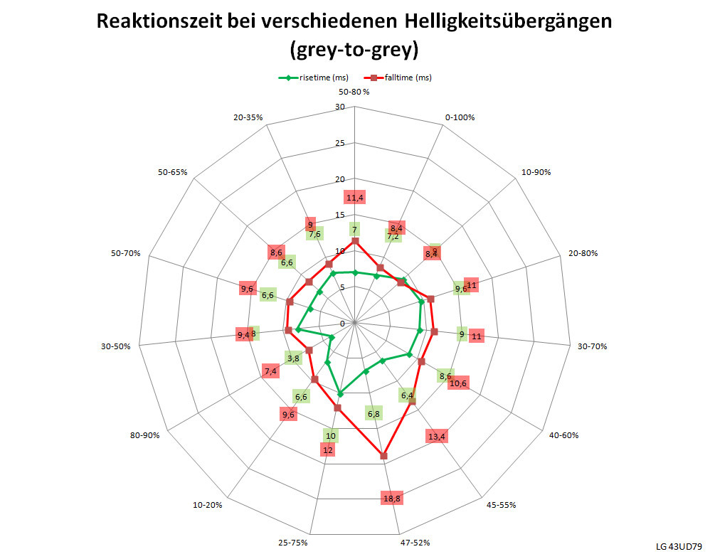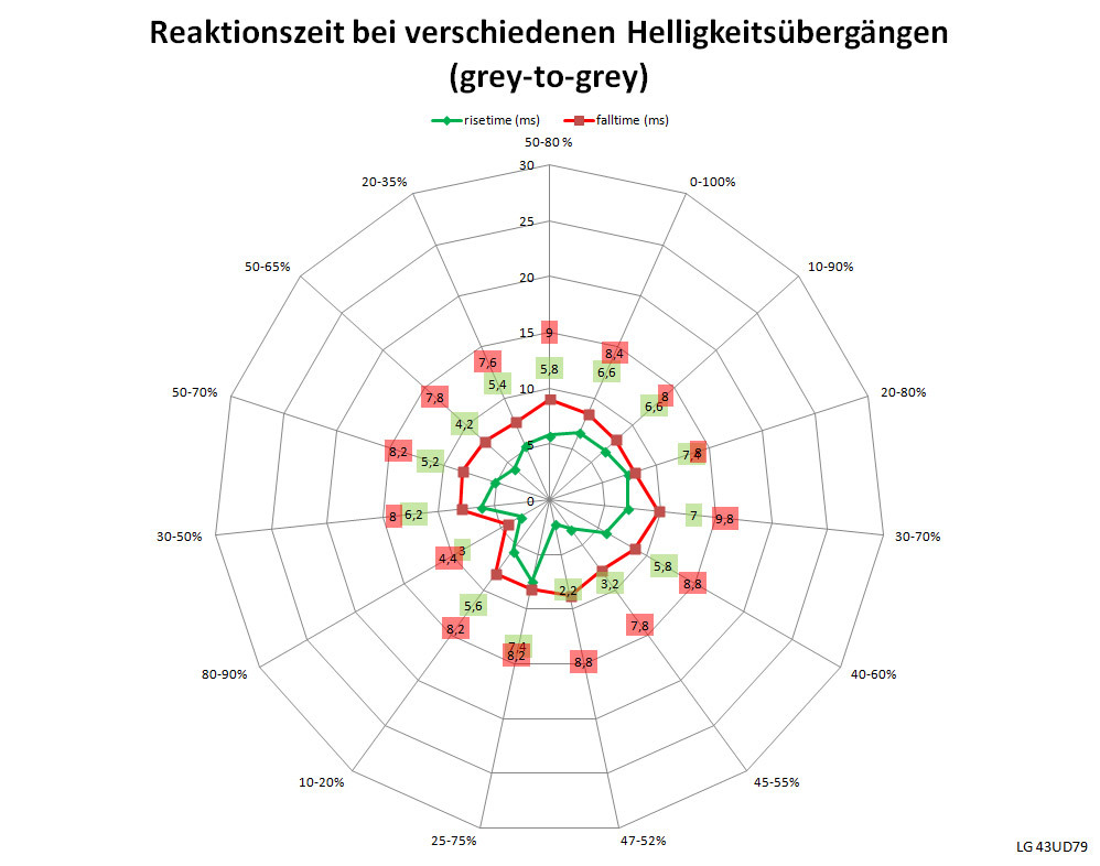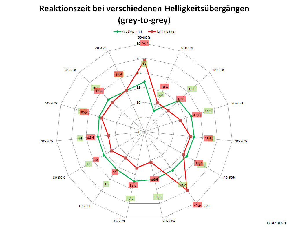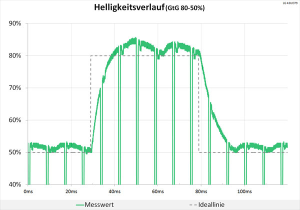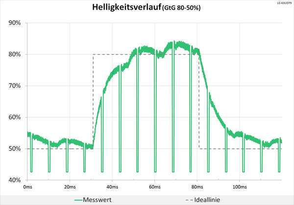 Die Reaktionszeiten des LG 43UD79 sind hier insgesamt recht ordentlich, während die Überschwinger/Doppelkonturen nur marginal spürbar zunehmen. Wir empfehlen daher, das Gerät generell in der höchsten Overdrive-Einstellung zu betreiben.