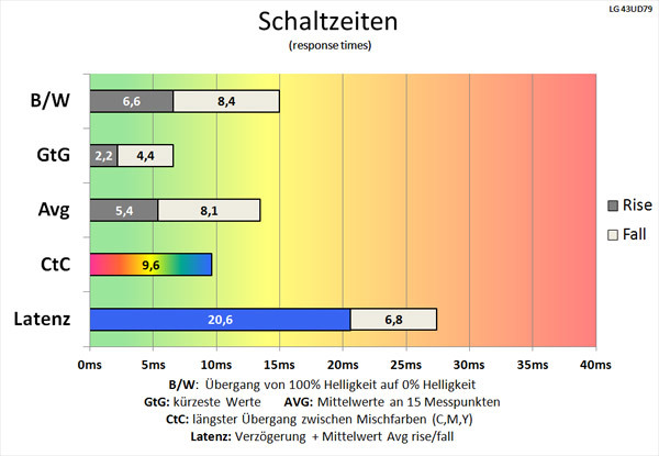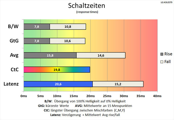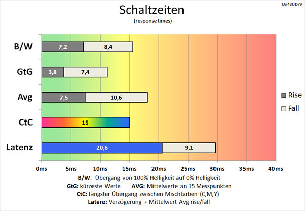 Das Schaltzeitendiagramm zeigt unter anderem, wie sich verschiedene Helligkeitssprünge addieren, wie schnell der Monitor in der Werkseinstellung im besten Fall reagiert und von welcher mittleren Reaktionszeit ausgegangen werden kann.