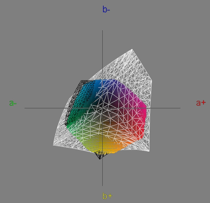 Erläuterung der 3D Ansichten: Das schwarze Gitter stellt den jeweiligen Standard-Farbraum dar, das weiße den Monitorfarbraum. Die tatsächliche Schnittmenge beider Farbräume macht der bunte Würfel kenntlich. Der Monitorfarbraum kann den tatsächlichen Farbraum dann nicht mehr darstellen, wenn das schwarze Gitter aus dem Würfel herausragt. Wenn der Monitorfarbraum größer ist als der jeweilige Standardfarbraum, so ragt das weiße Gitter aus dem Würfel heraus.
