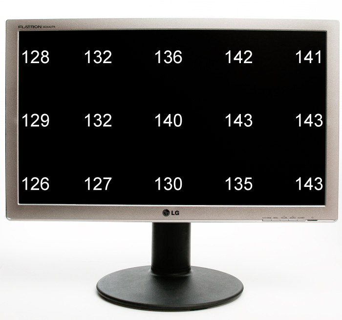 Insgesamt liefert der LG W2442PA bei der Helligkeitsverteilung ein sehr gutes Ergebnis, zumal die Abweichungen über große Flächen des Bildschirms sehr gering sind. Nach einer Kalibrierung mit einem Zielgamma von 2,2 wird dieser Wert stabil über große Teile des Panels gehalten.