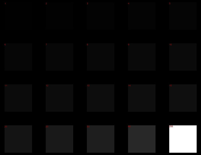 In der Standardeinstellung liegt der Kontrastwert bei 70 Prozent und stellt damit eine sinnvolle Vorgabe dar. Tonwerte sind in dieser Einstellung ab der ersten Stufe sichtbar. Am anderen Ende des Spektrums löst der Monitor ebenfalls alle Stufen auf. Eine Verringerung des Kontrastes macht daher keine weiteren Tonwerte sichtbar. Bei einer Erhöhung büßt man jedoch sofort Informationen ein und es kommt zu Kontrastverlust. Ein ändern des Kontrastwertes ist daher nicht notwendig, da die Werkseinstellungen absolut perfekt ist.