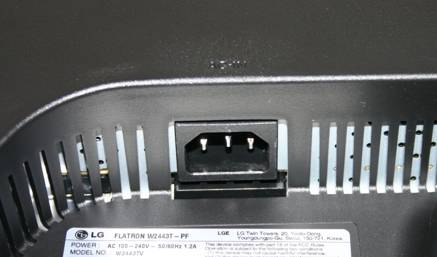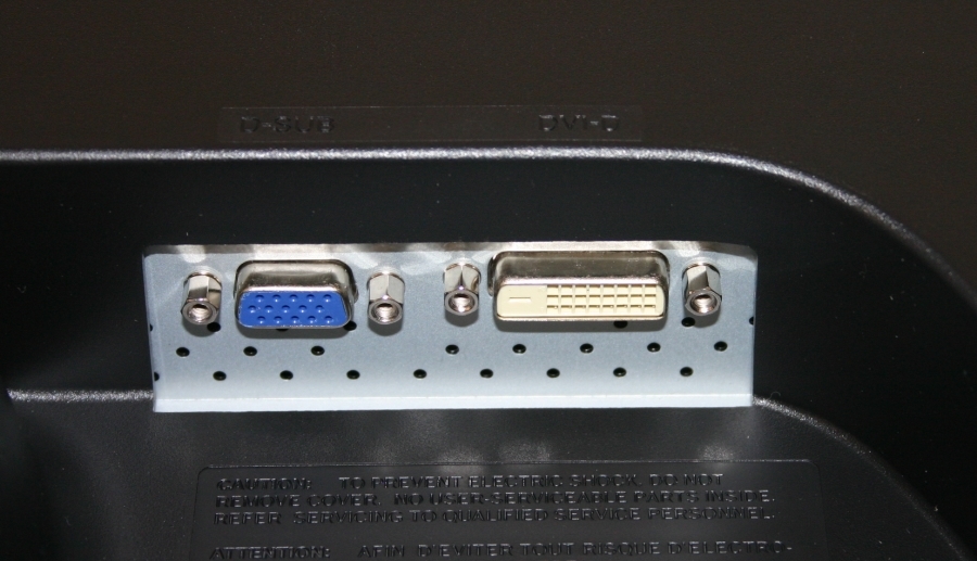 Wie eingangs erwähnt, fällt die Anschlussvielfalt moderat aus. Der W2443T verfügt über einen analogen D-SUB VGA-Anschluss und einen digitalen DVI-D Anschluss. Beide Eingänge befinden sich senkrecht von unten an der Rückseite des Monitors. Der Stromanschluss wurde in gleicher Ausrichtung an der gegenüber liegenden Seite des Standfußes positioniert.