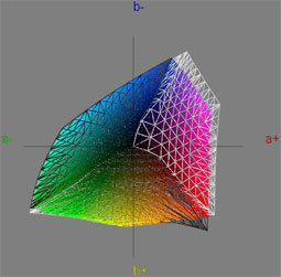 Erläuterung: In den 3D-Ansichten stellt das weiße Netz den jeweiligen Standard-Farbraum dar, das schwarze Netz den Monitor-Farbraum. Die tatsächliche Schnittmenge beider Farbräume macht der bunte Würfel kenntlich. Dort, wo das weiße Netz aus dem bunten Würfel herausragt, ist der jeweilige Standardfarbraum größer, als das, was der TFT tatsächlich darstellen kann. Ragt umgekehrt das schwarze Netz aus dem Würfel heraus, so ist an dieser Stelle der Monitorfarbraum größer als der jeweilige Standard-Farbraum.