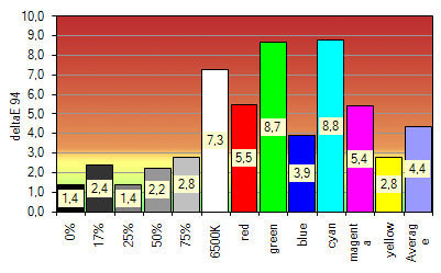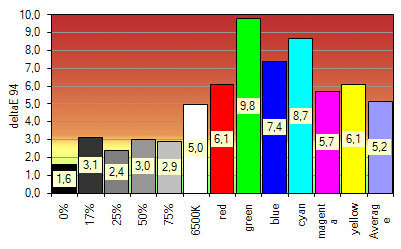 Bei der Farbgenauigkeit zeigen sich hingegen erste Abweichungen der 8-Bit-Ansteuerung. Gleichwohl sind die Ergebnisse für ein solches Panel ziemlich gut und zum Beispiel etwas besser als beim Dell 2709W.