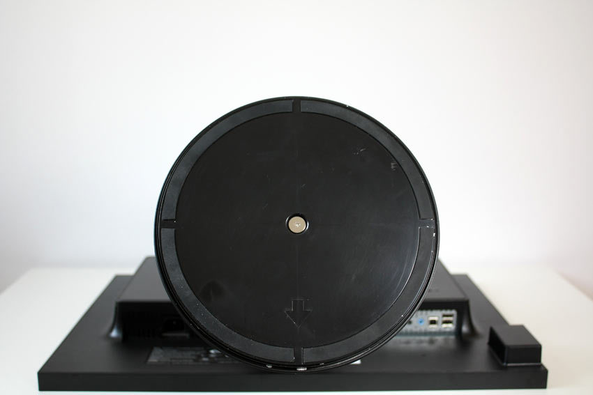 Der Standfuß mit rundem Standteller, ist beim NEC EA244WMi ein wenig nach hinten geneigt. Eine Drehscheibe im Standteller, erlaubt die fast uneingeschränkte seitliche Drehung. Gummierte Auflagen an der Unterseite des Standtellers verhindern effektiv ein Verrutschen des Monitors auf dem Schreibtisch.
