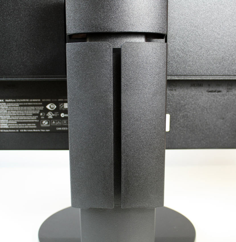 Optisch wie funktional gut gelöst ist der Kabelkanal beim NEC EA244WMi. Von den Anschlüssen werden die Kabel zum Standfuß geführt, eingefasst und nach unten geleitet. Die Kabel werden durch dieses System fast vollständig verborgen. Ein ordentlicher Schreibtisch ist die Folge.