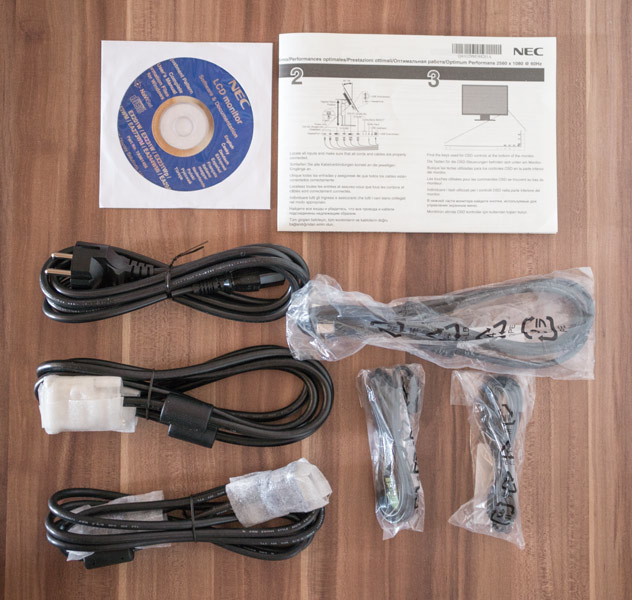 Im Lieferumfang sind bis auf ein HDMI- und ein DisplayPort-Kabel alle Verbindungskabel enthalten. Eine Schnell-Anleitung wie auch eine Software-CD mit ausführlichem Handbuch als PDF-Datei liegen dem Paket bei. Der Standfuß ist demontiert und hat seinen sicheren Halt in der Seitenwand der Styropor-Verpackung und kann während des Transports nicht das Panel beschädigen. Gleiches gilt für alle Kabel, die beigelegt sind.