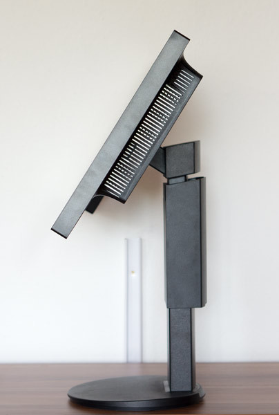 Der Trägerarm ist an der VESA100-Bohrung mit dem Panel verschraubt und verleiht dem Monitor außerordentliche Ergonomie und hervorragende Stabilität. Dieser ermöglicht eine Höhenverstellung von 130 mm. Dabei ist die Unterkante des Panels 21,5 cm von der Arbeitsfläche entfernt. In der tiefsten Stellung sind es 8,5 cm. Der untere und obere Rahmen sind 18 mm breit, die Rahmen links und rechts messen je 15,5 mm. Das Panel kann um -5° und +30° geneigt werden.