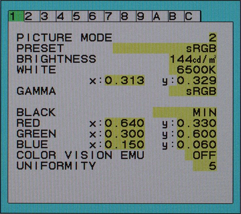 Die mächtige Farbraumemulation des NEC PA241W wird durch die Vorgabe der gewünschten Normfarbwertanteile für die Primärfarben realisiert. Eine Auswahl des sRGB-Bildmodus setzt das Ziel beispielsweise auf die relativ zu D65 als Weißpunkt definierten Werte. In diesem Zusammenhang muss man bei der Auswahl des gewünschten Emulationsziels etwas aufpassen. Wir werden darauf noch an späterer Stelle detailliert eingehen. Die Beschränkung auf die Festlegung von Weißpunkt und Primärfarbpositionen als Normfarbwertanteile ist ausreichend, weil sich die Helligkeitskomponente bei unterstellter Linearität implizit ergibt.
