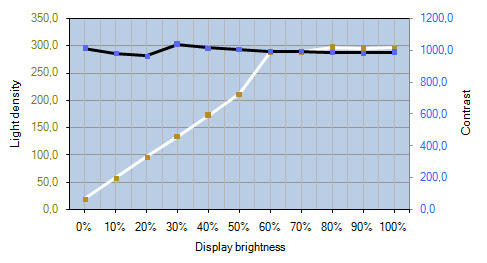 Ohne ColorComp liegt das Kontrastverhältnis bei rund 1000:1 (unwesentlich höher mit nativem Weißpunkt) für alle Leuchtdichten. Die Helligkeit wird dementsprechend ausschließlich über die Intensität der Hintergrundbeleuchtung reguliert.