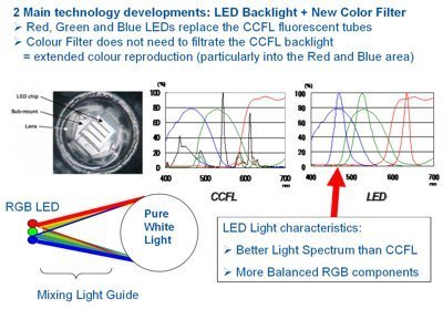Die LEDs werden in der Intensität so angesteuert, dass sie zusammen ein weißes Licht innerhalb eines bestimmten Spektrums erzeugen. Der Vorteil gegenüber einer CCFL-Röhre (Cold Cathode Fluorescent Lamp) liegt darin, dass das LED-Licht störende Frequenzanteile minimiert.