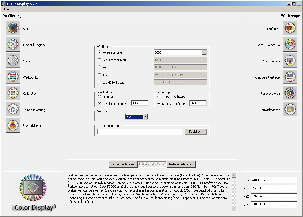 Der Workflow mit iColor Display ist unkompliziert. Die Software setzen wir auch im Rahmen der Softwarekalibration für unsere Testbildschirme ein. Der Benutzer kann das Kalibrationsziel in einem Konfigurationsfenster individuell festlegen.