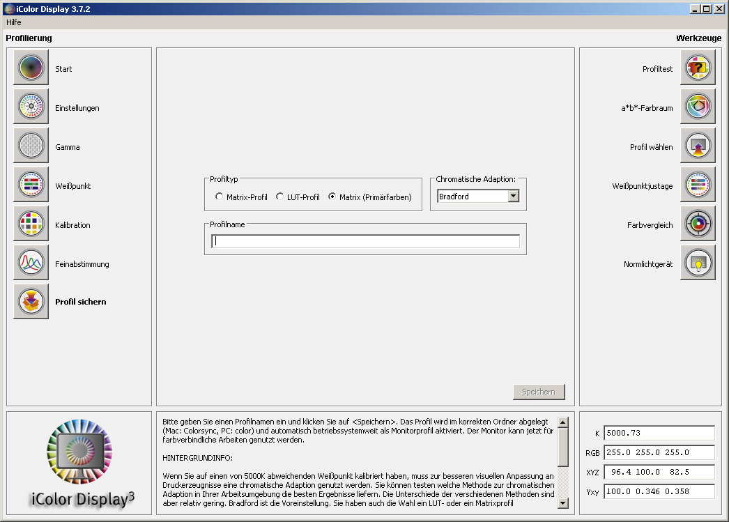 Nach der Profilierung ist eine Speicherung als Matrix- oder LUT-Profil möglich. Da im ICC-Workflow immer relativ zu D50 gearbeitet wird, ist eine chromatische Adaption während der Profilerstellung sinnvoll. Zur Auswahl stehen verschiedene Optionen, von denen i.d.R. „Bradford“ die beste Lösung darstellt.