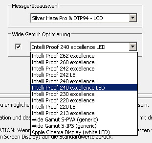 Bei Verwendung eines Colorimeters (idealerweise das mitgelieferte X-Rite DTP94B) sollte der Benutzer unbedingt die Korrektur für das RGB-LED Spektrum aktivieren.