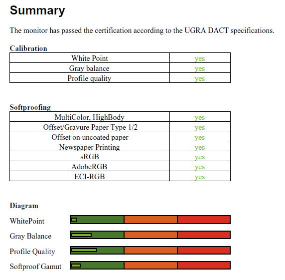 Nachfolgend haben wir die Hardwarekalibrierung messtechnisch überprüft. Zunächst wurde zu diesem Zweck eine Kalibrierung und Profilierung mit dem EyeOne Pro durchgeführt und anschließend, unter Berücksichtigung des so erstellten Monitorprofils, mit sRGB, AdobeRGB und ECI-RGB 2.0 als Arbeitsfarbraum verglichen. Abschließend haben wir auf die Empfehlungen der UGRA für Softproofing kalibriert und den UGRA-Test durchlaufen lassen. Wir weisen an dieser Stelle aber noch einmal darauf hin, dass das UDACT mit jedem Kalibrationsziel (erfolgreich) durchlaufen werden kann.