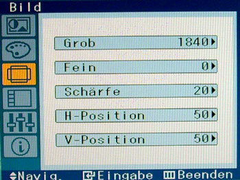Hier stehen für die Anpassung eines analogen Bildsignals die folgenden Einstellungen bereit: Grob (entfernt z.B. vertikale Streifen), Fein (entfernt z.B. horizontale Streifen), Schärfe (definiert die Bildschärfe, Standardwert 20), H-Position (verschiebt das Bild horizontal), V-Position (verschiebt das Bild vertikal).